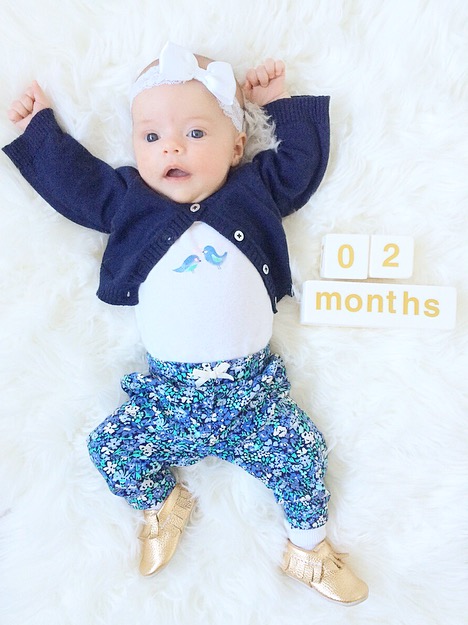 Our little pumpkin was 2 months old yesterday! Some days it feels like just yesterday that we came home from the hospital whereas other days it feels like we have been doing this for a long time (mostly when we are experiencing the 3am fussiness after feedings!). Yes, that’s right; to all of you that absolutely hated us after reading our 1 month update we have now officially lost a few night’s sleep. But perhaps to your dismay it’s only been a FEW nights. Our babe is still an amazing sleeper overall and on average we are still stretching 6 hours between feedings each night. Typically we feed her around 11 pm and she doesn’t wake up until somewhere between 5-7 am, which makes mommy very happy. It also makes mommy even happier when she falls back asleep for at least another 4 hours! She feeds anywhere between 3 to 5 hours in the day but is still usually more consistent with the 3 hour mark.