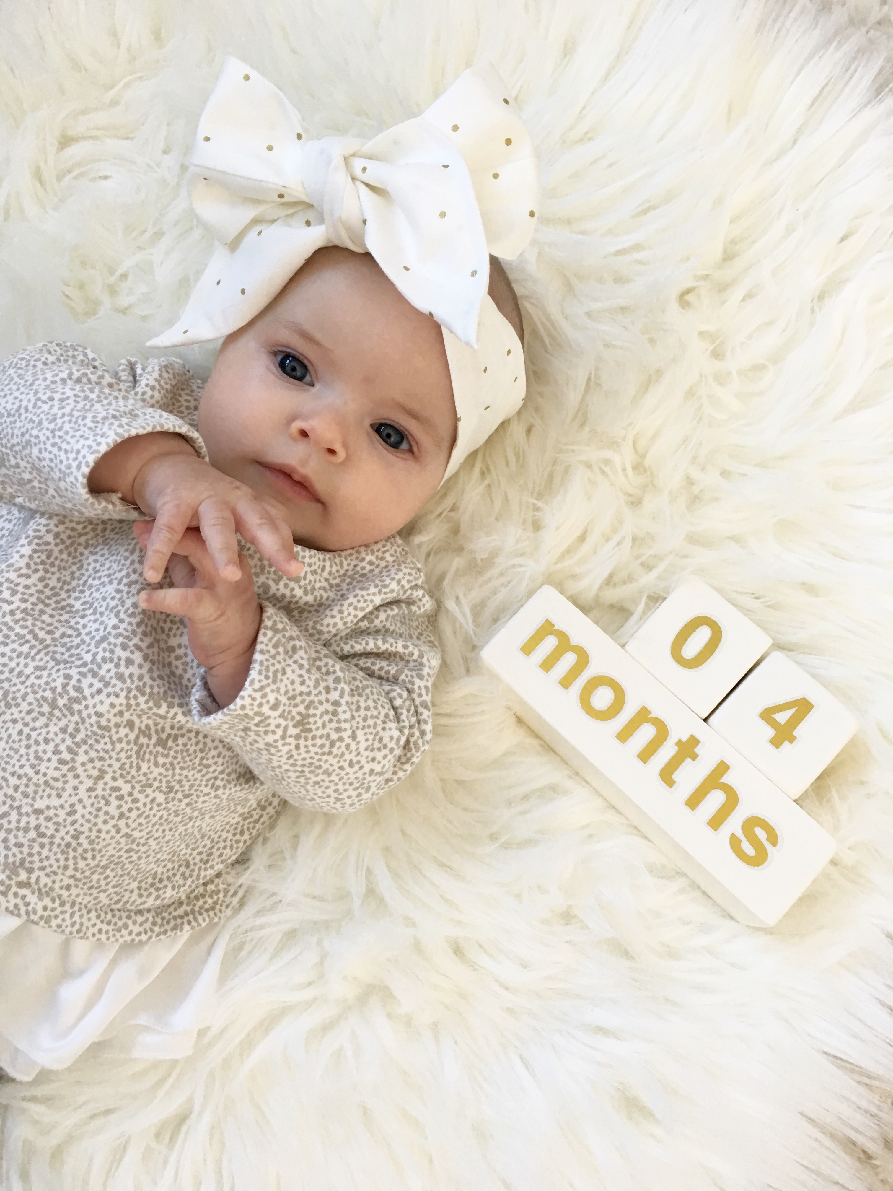Our little pumpkin turned four months old on the weekend! Wow, how time flies! She currently weighs 11 pounds, 7 ounces and is still a tiny one as she is in the 5th percentile for weight. She is now back to being average for length and that is definitely showing in her onesies!