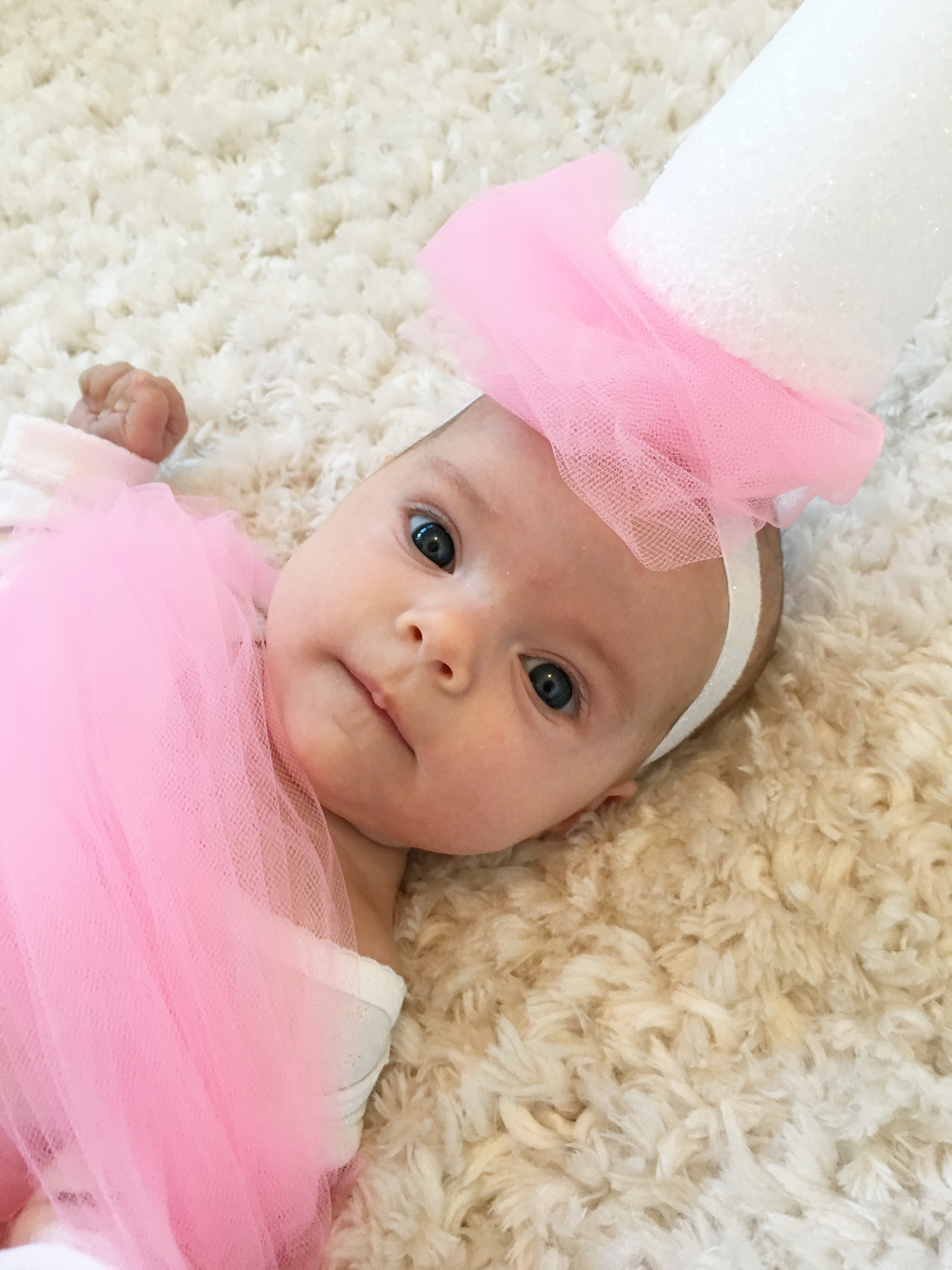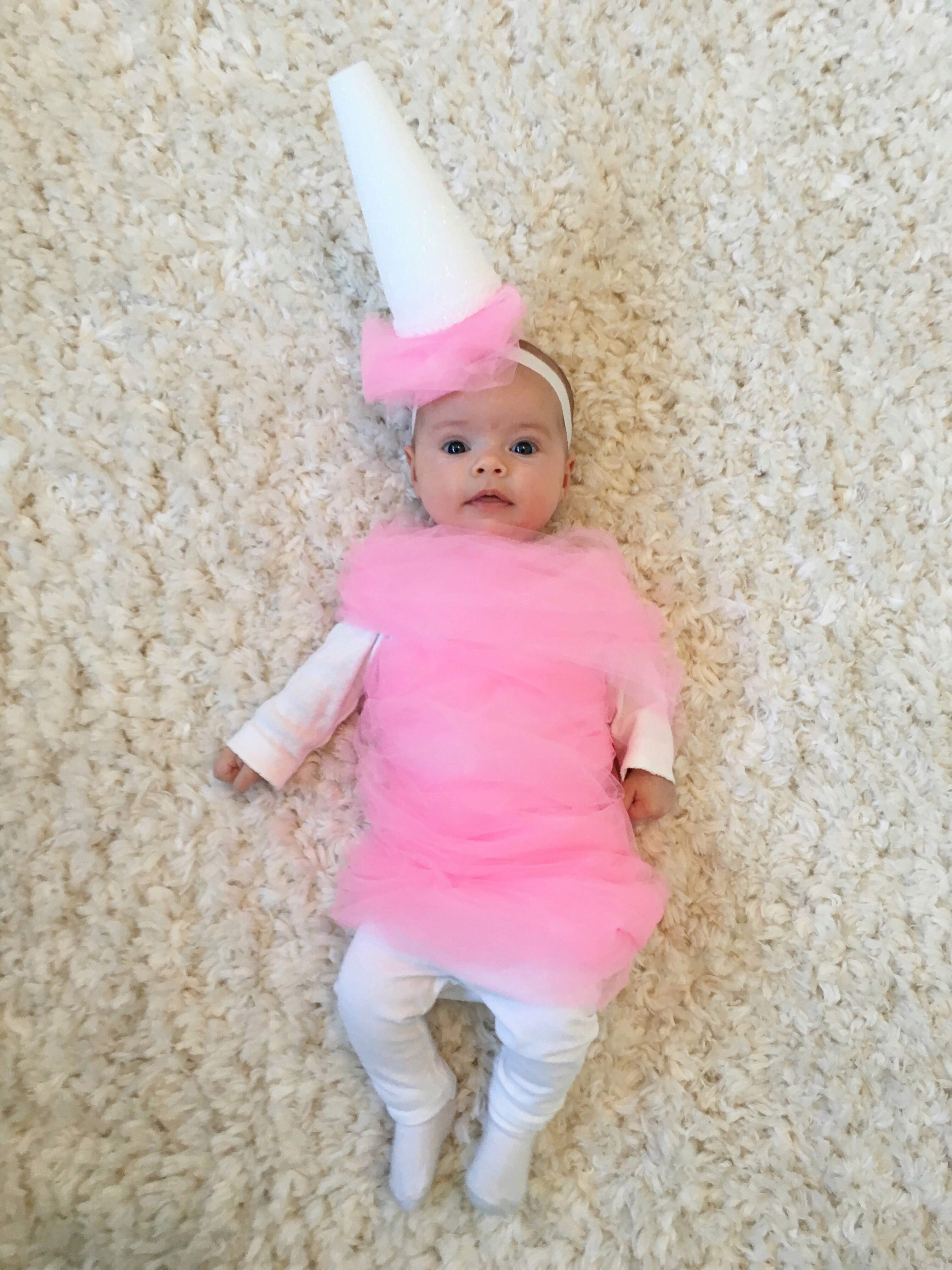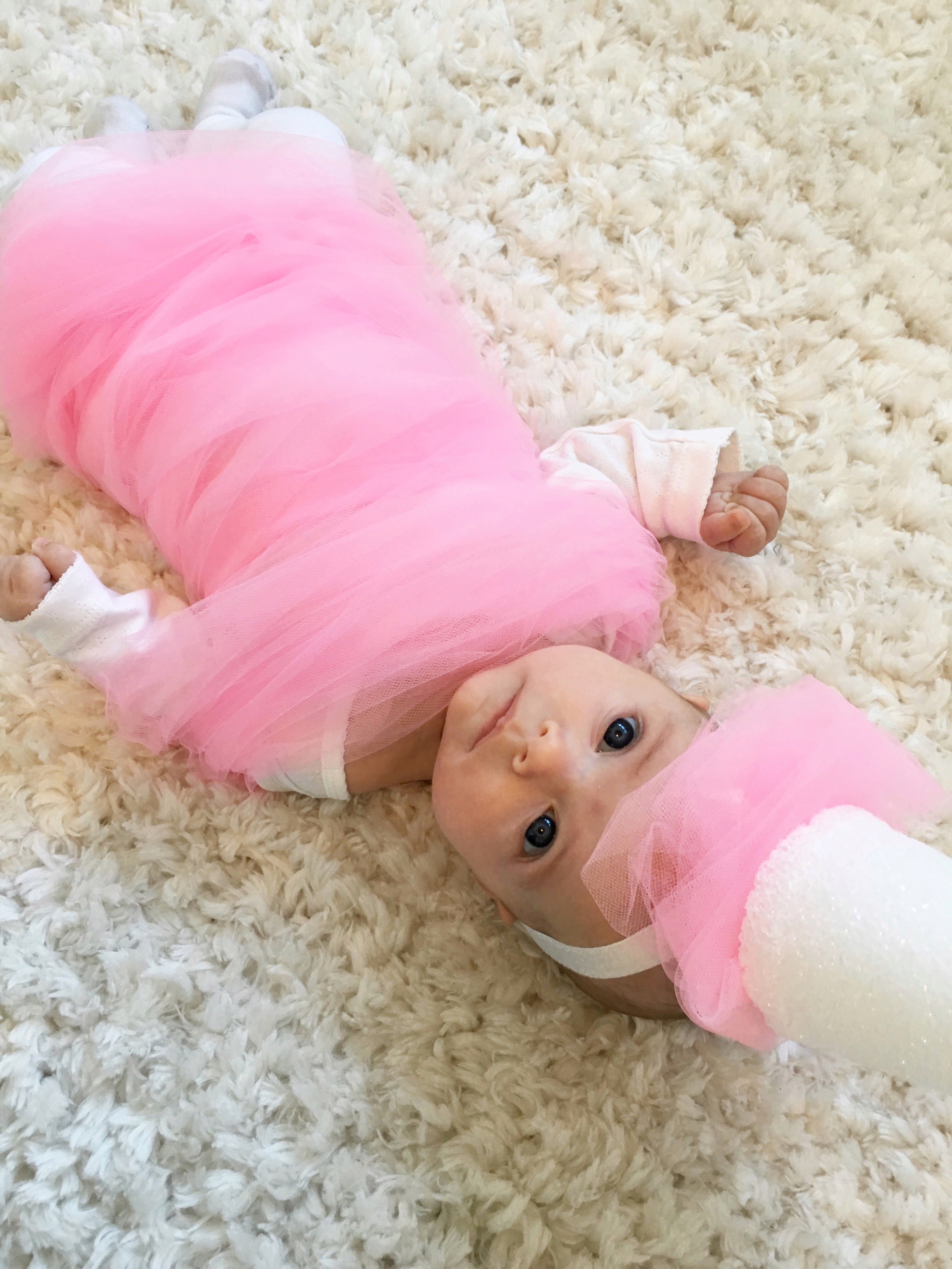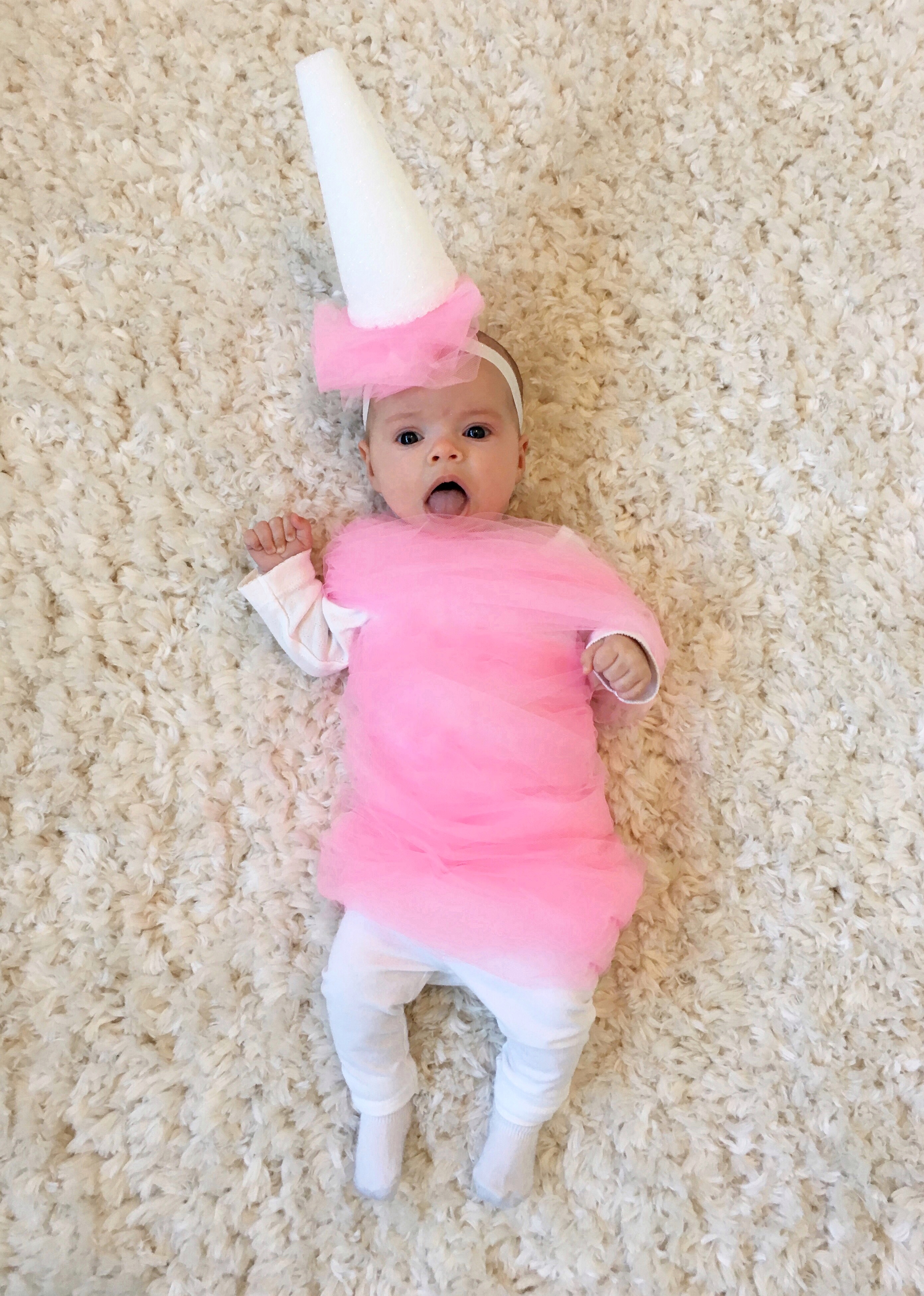 I’ve always enjoyed putting together my own Halloween costume, even though there are tons of awesome options out there to purchase. The excitement for me is pulling together items from stores that I can customize or finding the perfect article of clothing that screams an idea at me from the local thrift store. For Emsley’s first Halloween I knew I needed to channel my creativity into her costume as these days I no longer have anywhere to wear one! Being that Emsley is only three months old I knew I needed a costume that would look cute on her from a top down view as she spends the majority of her days lying on her back. I randomly saw a picture of a “Cotton Candy” costume from Pottery Barn Kids and knew I could easily make a version of it.