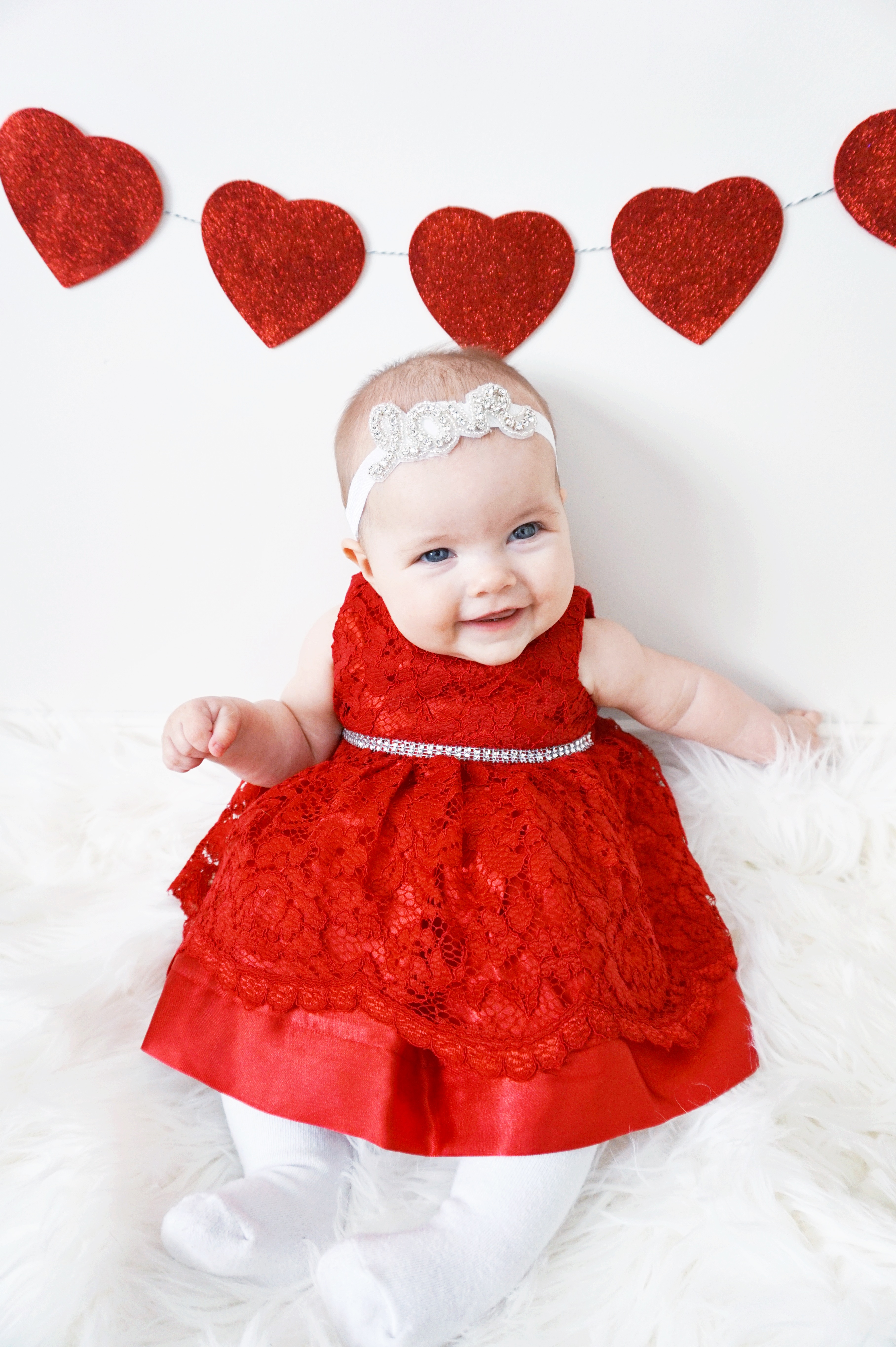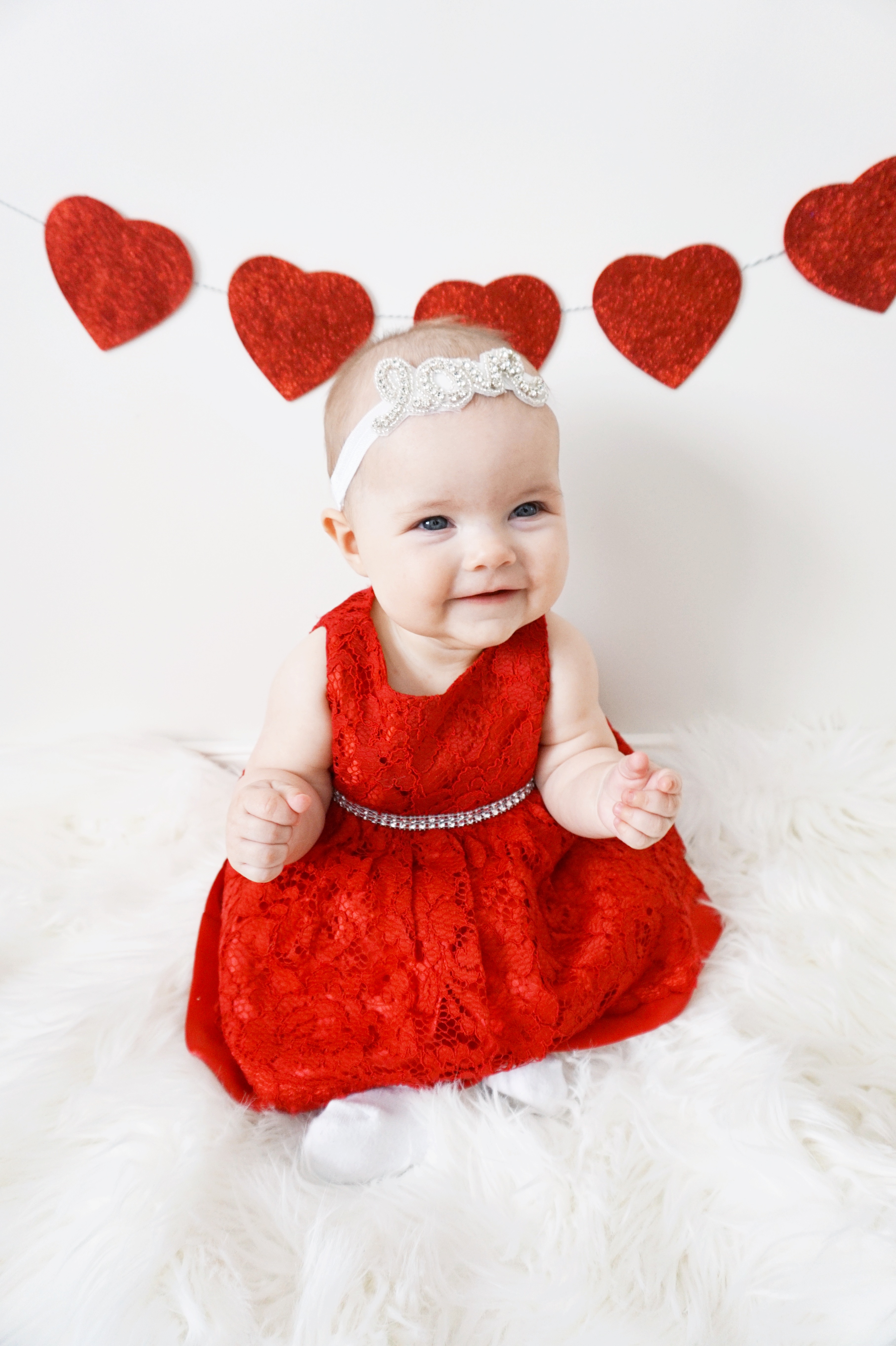 We tend to have daily photoshoots around here so I felt that Valentine’s Day was no exception. I found some glitter hearts and our favourite LOVE headband and pulled out the camera. This girl is starting to sit up on her own and is becoming quite the little personality. We are seeing more and more of who she is each day and it’s even more fun now to capture new expressions!