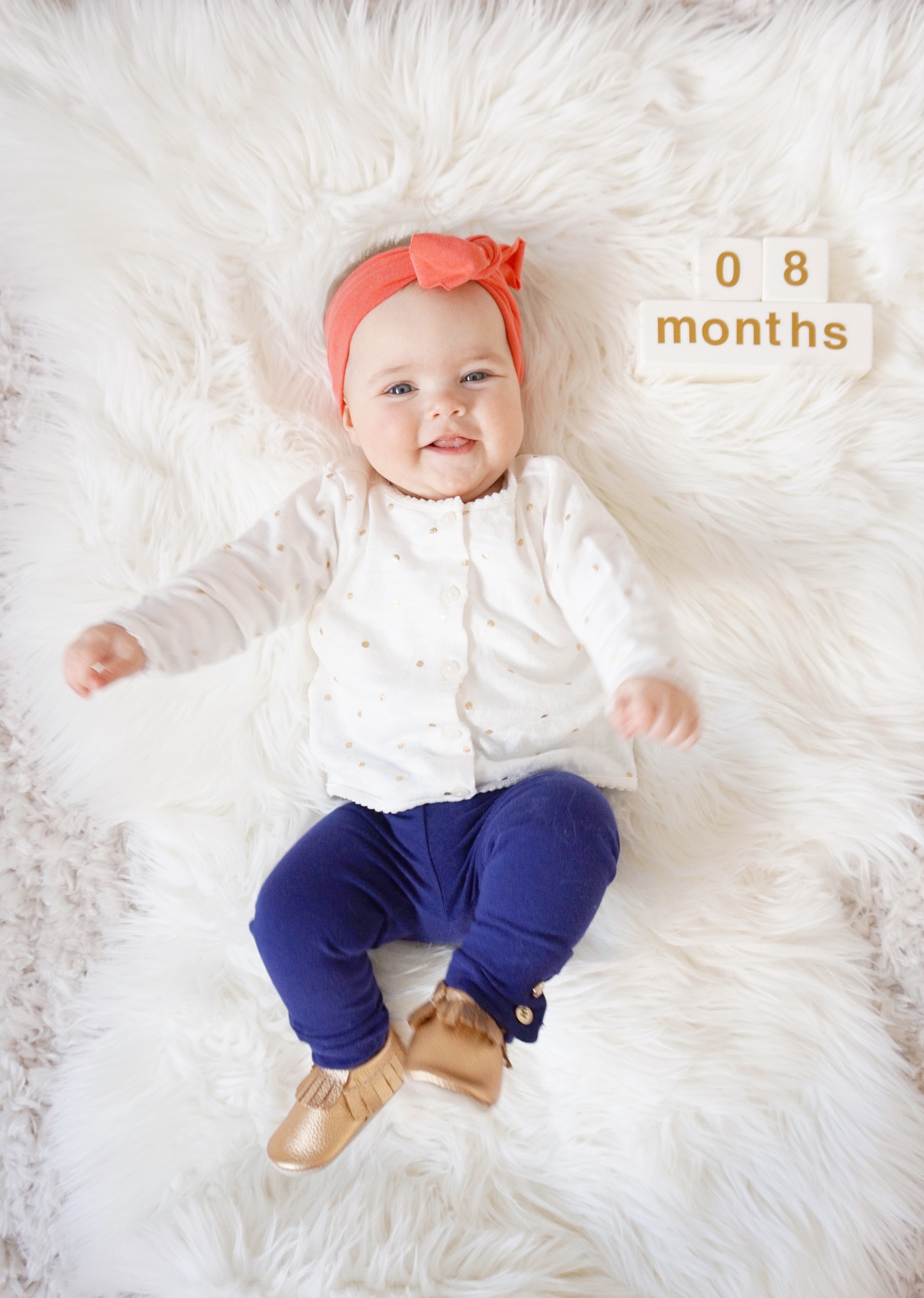 Today marks 8 wonderful months of having our sweet Emsley in our lives! I have recently mentioned on Instagram how each milestone or month that passes I find myself saying “this is the best part” only to find myself saying it again as a new milestone or stage emerges. This wonderful, tiny human being has filled my heart with great amounts of joy as she grows and develops into such a fun, silly, and exciting girl. I am so grateful each day of this motherhood journey as it only keeps getting better and better!
