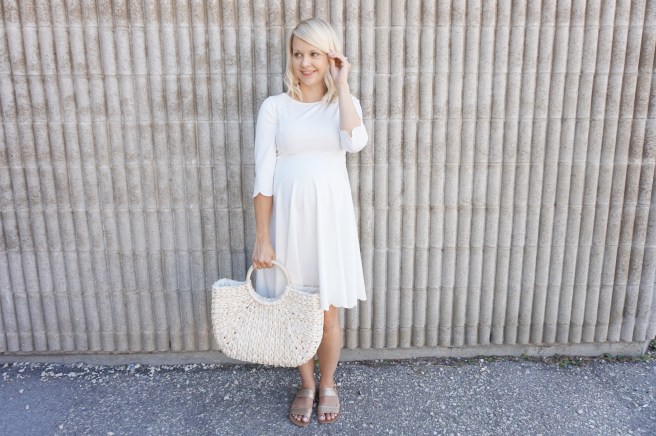 I wanted to share another great dress find from Pink Blush Maternity! This white scalloped dress was the perfect choice for Miss Lace’s 2nd birthday party. I am completely on board with the mentality of the little white dress being the new little black dress these days and like any woman I feel like I can’t have enough of them! This dress can easily be dressed up with heels and jewels but I also love that I can pair it with a pair of flat sandals and a casual straw tote like this one from Forever 21 and it becomes the perfect dress for date night or to wear to work. The material is super comfy and stretchy making it easy to get on as well as leaving plenty of room for baby belly growth! And the best part is, once again it doesn’t have that “classic maternity” dress look to it! I love scallop details in any form – on clothes or home decor and the subtle detailing on this dress is the perfect addition to take it from a simple white dress to something unique! It comes in a BUNCH of different colours; I’m wearing size small. All the colours can be shopped here!