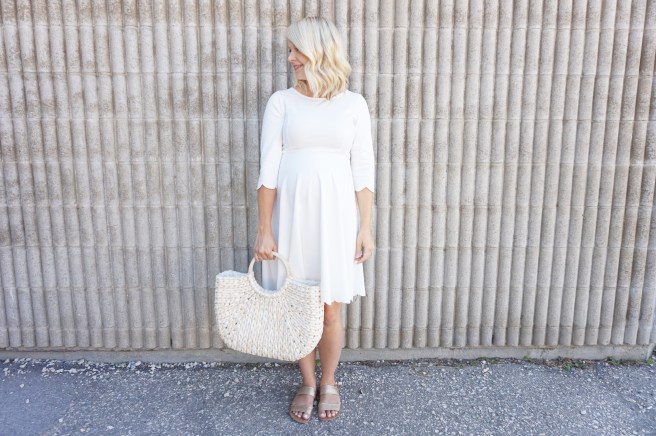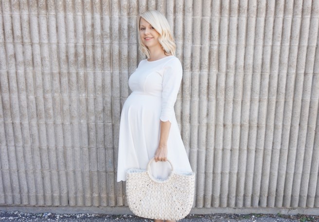 I wanted to share another great dress find from Pink Blush Maternity! This white scalloped dress was the perfect choice for Miss Lace’s 2nd birthday party. I am completely on board with the mentality of the little white dress being the new little black dress these days and like any woman I feel like I can’t have enough of them! This dress can easily be dressed up with heels and jewels but I also love that I can pair it with a pair of flat sandals and a casual straw tote like this one from Forever 21 and it becomes the perfect dress for date night or to wear to work. The material is super comfy and stretchy making it easy to get on as well as leaving plenty of room for baby belly growth! And the best part is, once again it doesn’t have that “classic maternity” dress look to it! I love scallop details in any form – on clothes or home decor and the subtle detailing on this dress is the perfect addition to take it from a simple white dress to something unique! It comes in a BUNCH of different colours; I’m wearing size small. All the colours can be shopped here!