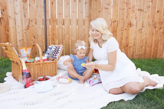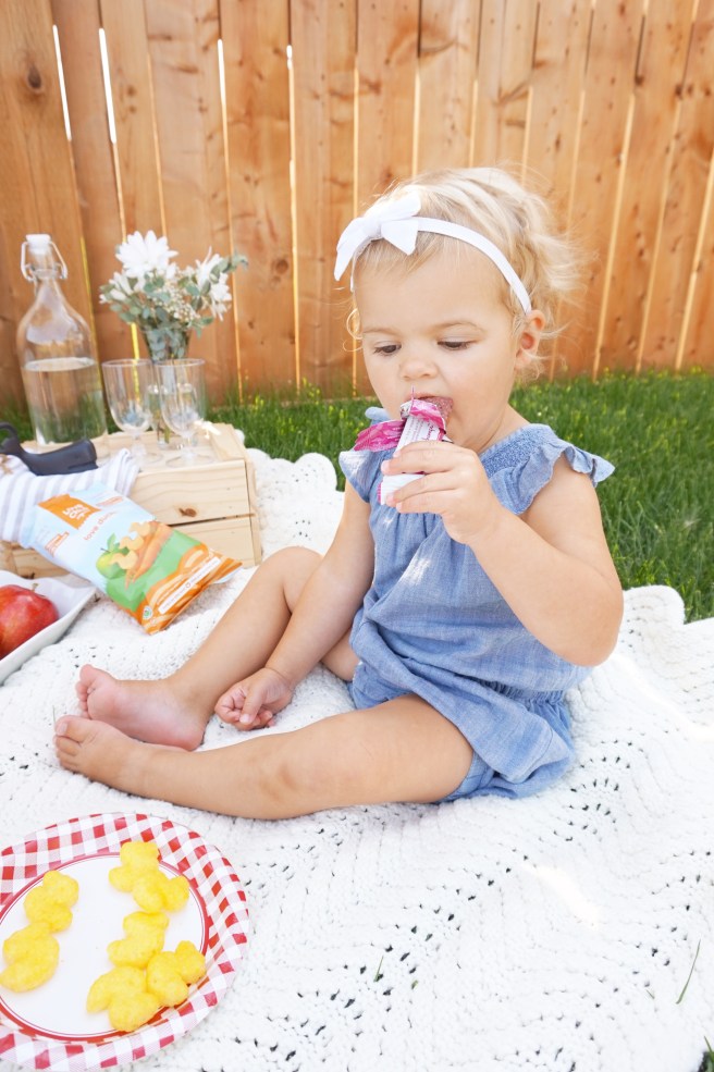 If you follow me on Instagram, you’ll know that we’ve been tackling potty training over here…each day at a time.. One, of the few downsides to potty training is that it has led to many days of isolation, being confined within our home, forcing this momma to get creative. On the not so great days outside, the go to recently has been having indoor picnics in our living room on a blanket, but since the weather turned warm again, getting outside became a must! I decided to create a little outdoor picnic in our backyard for Miss Lace to find when she woke up from a nap last week. She absolutely LOVED the concept of it and has been asking for more picnics since! When Love Child Organics offered to send me some samples of their toddler snack products, I instantly agreed! We have been a Love Child fan since Ems started solids, buying their purees and toodle O’s. More recently, Ems is loving their lil’ shake drink in the chocolate flavour which is packed with protein. As a parent, I love the fact that Love Child uses only 100% organic ingredients, with no added sugars. Oh, and the fact that they are Canadian based doesn’t hurt either!