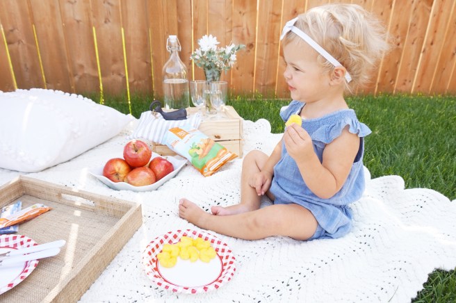 If you follow me on Instagram, you’ll know that we’ve been tackling potty training over here…each day at a time.. One, of the few downsides to potty training is that it has led to many days of isolation, being confined within our home, forcing this momma to get creative. On the not so great days outside, the go to recently has been having indoor picnics in our living room on a blanket, but since the weather turned warm again, getting outside became a must! I decided to create a little outdoor picnic in our backyard for Miss Lace to find when she woke up from a nap last week. She absolutely LOVED the concept of it and has been asking for more picnics since! When Love Child Organics offered to send me some samples of their toddler snack products, I instantly agreed! We have been a Love Child fan since Ems started solids, buying their purees and toodle O’s. More recently, Ems is loving their lil’ shake drink in the chocolate flavour which is packed with protein. As a parent, I love the fact that Love Child uses only 100% organic ingredients, with no added sugars. Oh, and the fact that they are Canadian based doesn’t hurt either!