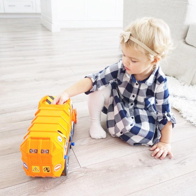 I asked Miss Lace what she wanted from her little brother once he arrived to which she replied, “a garbage truck”. I ventured to Homesense, because they literally have EVERYTHING, (and once fall hits they fill their shelves with toys for Christmas) and purchased the best one I could find, with all the bells and whistles!
