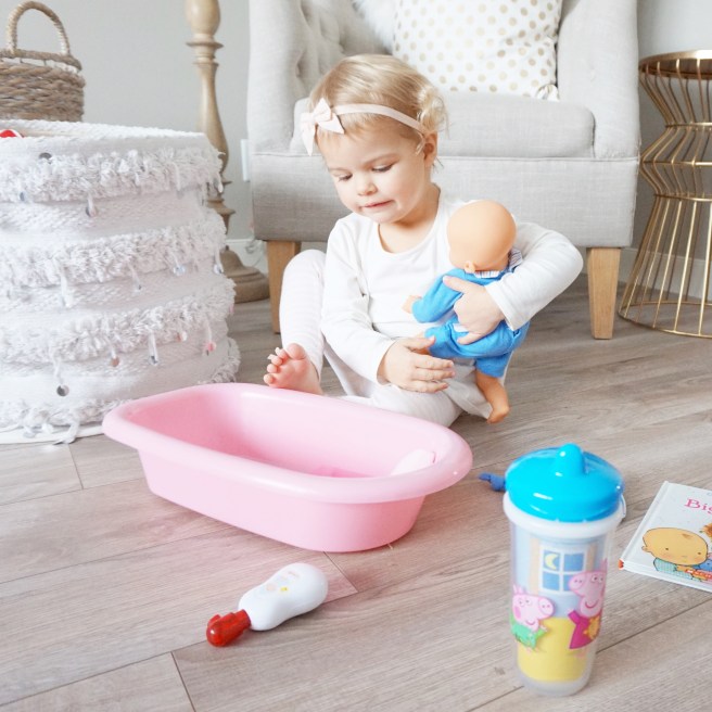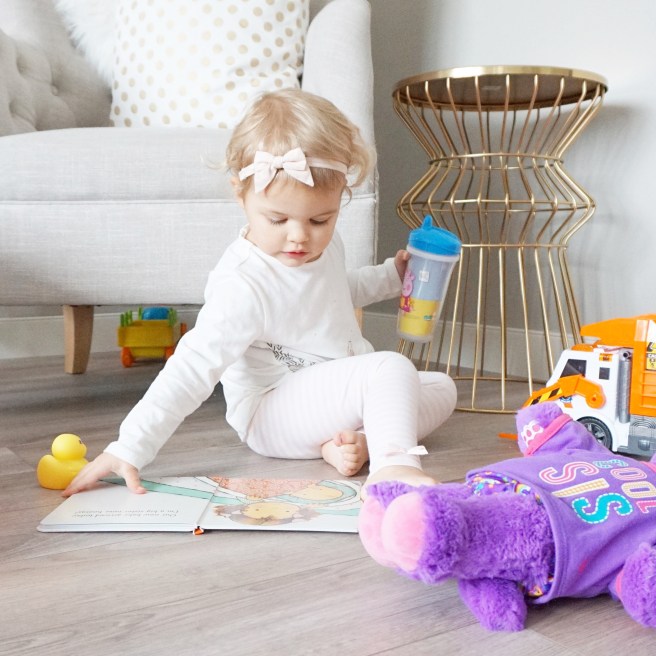 I know materialistic items are not going to make up for the fact that I have less time to spend with Miss Lace one-on-one but these items have definitely made #ForBetterBeginnings, helping her transition with baby brother coming into our lives, and as a first time mom of two, I will take anything these days that make life easier! Ems chooses to sleep with her new purple kitty every night, is so proud of her big girl cup, to show off her garbage truck to people who are visiting, and loves to mimic me giving her brother a bath with her new doll. Her happiness in these moments warms my heart and makes me so proud of how well she’s transitioned into her new role as big sister!