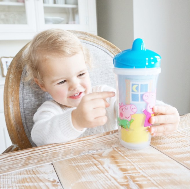When Playtex Baby™ asked if I wanted to partner with them and become a #PlaytexMom to make my life a little easier on my new journey with two babes, I couldn’t say no! Ems loves Frozen and Peppa Pig so receiving a Peppa Pig Playtex® Sipsters® Cup from Playtex Baby™ was a great surprise! The timing was perfect as she was just starting to adapt to her new sister role. Baby brother has received a lot of gifts lately and there’s been hints of jealousy from big sis who wants to now be swaddled, held or has even been caught stealing his soothers when no one is looking. Getting a new “big girl cup” as she calls it with a pretty blue lid made Ems feel proud and excited! As a #PlaytexMom, I can let her use this cup on her own because it is literally spill proof, which is great because I now have less time to monitor her closely like I used to. Annnnnd if you know our house, white couches + the potential of coloured juices spilling = not a great combination. Both Peppa and her little brother George are on the cup, an exact reflection of our new sibling situation at home and Ems loves being able to connect and relate to it. She also loves pointing out the moon everyday at home so the little moon peeking through the window on the cup was an added bonus!