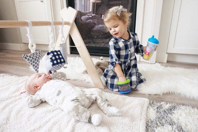 We also felt the stress of hosting for the first time. We absolutely love to host and are always happy to do it but even getting our house ready with two littles presented it’s own difficulties. When we had only Ems to care for we could easily trade her off between the two of us to get all the tasks done. Especially once she hit two years as her independence increased and her need to be watched closely, drastically decreased. Life however, with baby brother around meant one of us was always holding him or should I say protecting him from his big sister’s “snuggles”. #ForBetterBeginnings, my go to trick when attempting to keep Miss Lace off her brother is to give her a cup with a little snack in it. Being a #PlaytexMom, Playtex Baby™ sent me the Playtex® Twist ‘n Click® Snacker cup to try out. What I like about it, is that it has a lid that twists from the bottom when the cup is not in use ensuring all the little crumbs don’t fall onto my floor, purse, diaper bag or car depending on where we are using it. This snack cup is easy to hold which keeps her hands busy; stopping her from poking at her brother when I’m off doing something else. I also find giving her little jobs to do has been helpful but sometimes she wants to do the job and other times she has no interest!