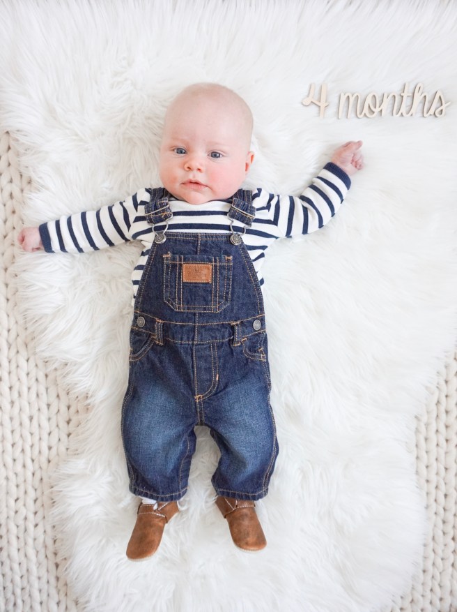 Four months old and I think Ever is experiencing his fifth cold. Sister has been super sick this week and the expression “siblings share everything” is oh so very true. Our little guy is coughing and stuffed up but true to his personality he’s still smiling throughout it! I seriously can’t get over how happy he is and how much he lights up around others. At this age, Miss Lace used to be happiest on her change table and would kick and squeal away while laying on it but this guy seems to enjoy catching people’s eyes the most! He’s always looking to engage others and will beam the cutest toothless grin when he finds you. He squeals and talks away when we hang out with him, particularly while laying under his play gym. The play gym seems to still be his favourite toy and he likes spending his mornings under it; usually about an hour and a half playing away. We brought out the Skip Hop Activity Table and he’s been enjoying that as well. We tried the Jumperoo but he’s a spitter upper and jumping really increased that so maybe we will stick with the table for now. Our next goal is to try the Jolly Jumper but I’m a bit nervous about the movement and the likelihood of him puking everywhere!