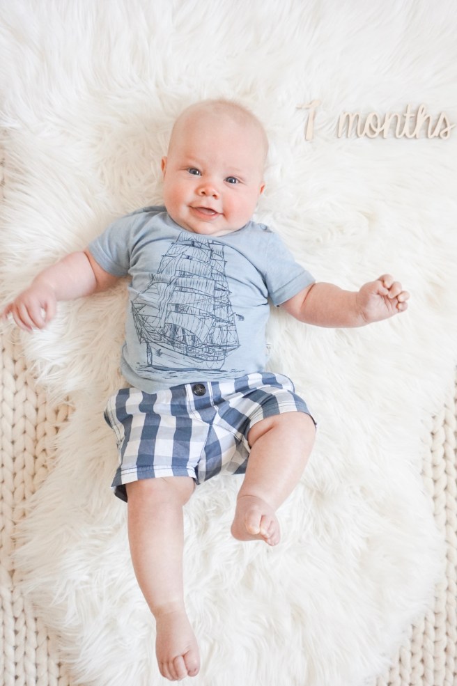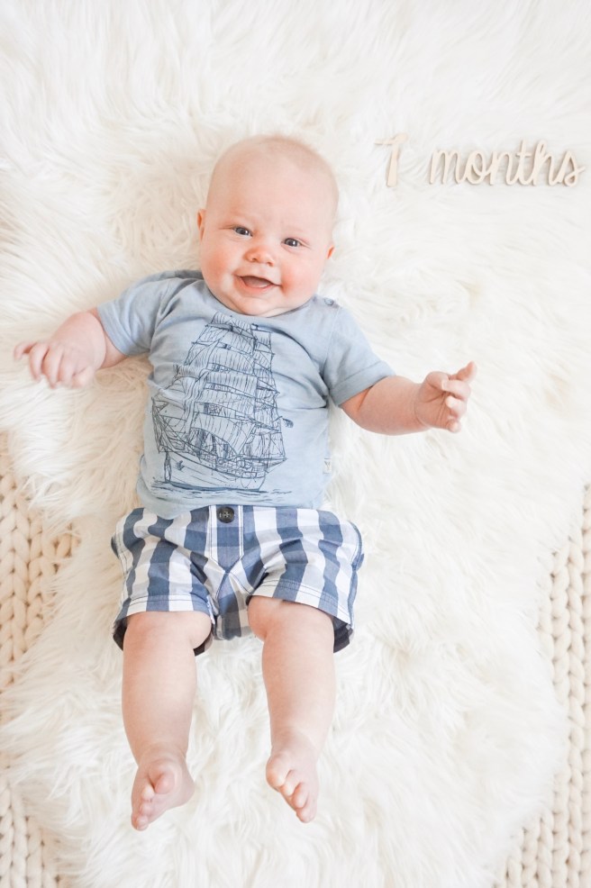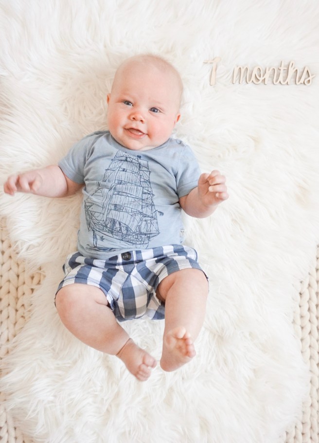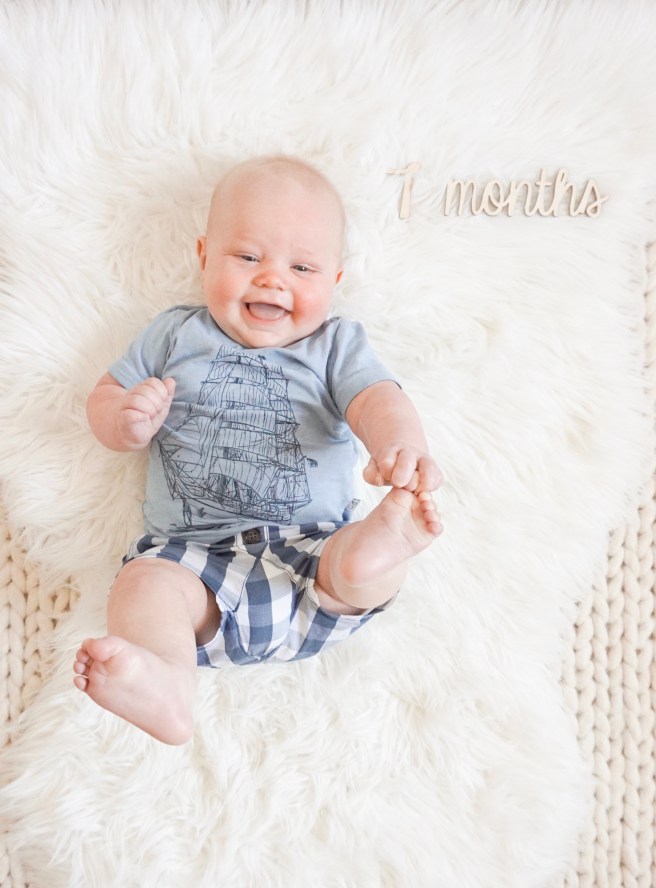 We first started with rice cereal and fruits, followed by some vegetables. It seems he isn’t a fan of thicker textures and would rather stick with the more watery based ones for now. He LOVES all fruits but has made many faces at sweet potato, carrots, avocados and peas. Shortly after we started giving solids at breakfast, I cut out breastfeeding during that session as he didn’t seem to need it anymore. I am now breastfeeding four times a day: when he wakes up, around lunch, supper and bedtime. Just after his 6 month appt. he weighed a bit over 18 pounds. He is now back in the average spots for both length and weight.
