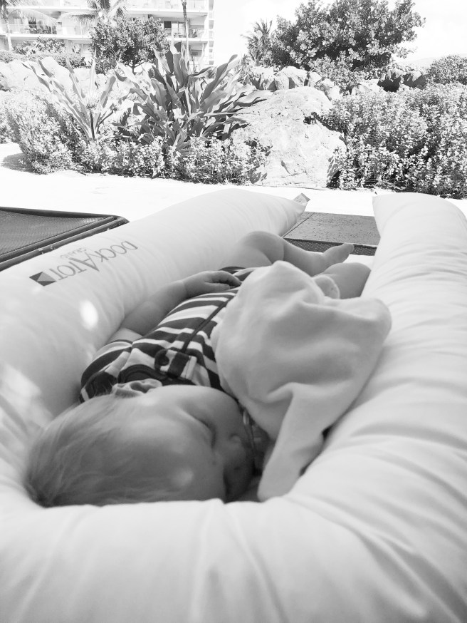I ended up trying the DockATot Grand Dock a couple of days into our trip (it got lost in flight transportation..) with great success! Our son snuggled in and was able to fall asleep very fast. He was very content and cozy while sleeping in there. It’s made of 100% natural cotton and is fully breathable. I placed the DockATot on a lounge chair next to me under the shade of some palm trees. I always made sure that I could be in arms length from him during the entire time he was in it. Obviously, with him being raised up about two feet from the ground, safety could be a concern, so I made sure that I was always right next to him. I was always able to touch him while he slept in the DockATot to ensure he was safe.