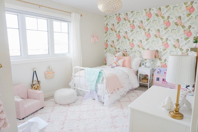 Another question I get asked lots is where her wallpaper is from; it’s from Anthropologie. We installed it in her nursery in 2015 and I still LOVE it as much as I did when I first picked it out. It makes me so happy when the sun is streaming in on it during the spring and summer months!