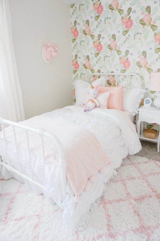 We first converted her crib into a toddler bed with a side rail and let her sleep in it for about one month. After that, we switched her to this current twin bed. She did great overall with both changes and was very excited to have a big girl bed! We never put up any side rails or any type of bumpers alongside her twin bed, because I honestly can’t stand the look of them. To be clear, IF she would have had lots of issues with falling out of the bed, I clearly would have put them up, strictly out of safety, but I figured I would try without them first. Instead, I stacked up all her throw pillows (she has a lot of them because I love throw pillows! haha) on the wall side of her bed. Then, on the other side of her bed, I put a small pillow against her nightstand to block her head from hitting her head on the corner of it. This worked for the most part, as she only fell out of the bed twice within the first six months, once off each side. Other than being a little scared, she was fine!