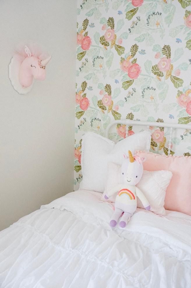 The unicorn on her wall was gifted and was supposed to be on a stick for her to “ride” on but unfortunately the stick broke in transit. I bought a plaque from Michaels, painted it white and hot glue gunned the unicorn onto the plaque so it could be used as decor! It was just too pretty to go to waste.