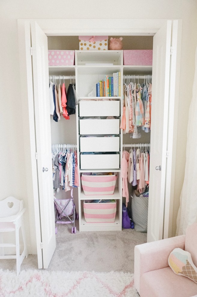 We used to have a larger Hemnes dresser from Ikea in her room along with a gallery wall of pictures above it. I got rid of that dresser and downsized to a smaller one, just big enough to house her basic clothing needs. The large dresser was oversized for her space and functioned mainly as a change table during its time, so we really no longer needed it. This new one we got her is also from Ikea and is linked here. It’s a bit more expensive than some of the other ones available at Ikea, but the detail, quality and finish is definitely nicer. I switched out the knobs to personalize it. We also added in some drawers to her closet to give her additional storage for clothes. Her Ikea closet hack can be seen here.
