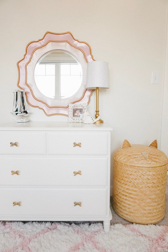 Her pink and gold mirror was a splurge item from Horchow that I couldn’t stop thinking about. I had seen it on social media and loved it but wasn’t sure I wanted to spend that much (especially with our current, awful exchange rate). I talked myself out of it and originally bought a gold mirror for a fraction of the price, but once we hung it up, I just didn’t love it. I sold it and ended up getting the one of my dreams and I don’t regret it one bit! I absolutely LOVE it! Again, the quality and finish is beautiful. I think it and her light fixture will be pieces that grow with her as she grows up and her room evolves and changes. I really see both as investment pieces! (My husband might disagree :P)