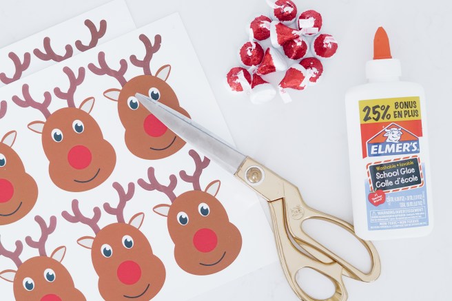 I had already bought these red and white Santa hat Hershey kisses, so I decided I would use them for Rudolph’s red nose. Obviously plain red ones would be ideal for Rudolph but it didn’t make sense to buy more when I had these already. I hand wrote a little personalized note on the back of each one and then used Elmer’s glue to stick on the Hershey kiss.